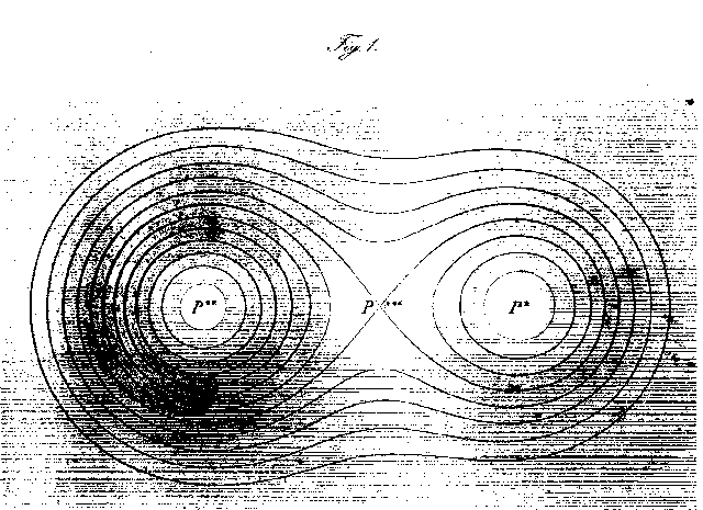 Beweis: Weil grad(V) zu jeder Niveaulinie senkrecht steht, ist entweder grad(V)=0 oder die beiden Tangenten in P*** fallen zusammen. Im zweiten Fall muß, da die beiden Maxima in je einer Öffnung der Acht liegen, grad(V) ins Innere beider Öffnungen der Acht zeigen, was unmöglich ist. Also ist grad(V)=0 und damit P*** ein Pol, aber ein Pol, welcher in Beziehung auf die zunächstliegenden Punkte innerhalb der beiden Öffnungen der Acht wie ein Südpol, in Beziehung auf die ausserhalb liegenden hingegen wie ein Nordpol betrachtet werden muss [Gauß 1839, Nachdruck 1877, 136 und fig. 1; die von mir verwendeten Bezeichnungen sind im wesentlichen von Gauß übernommen].