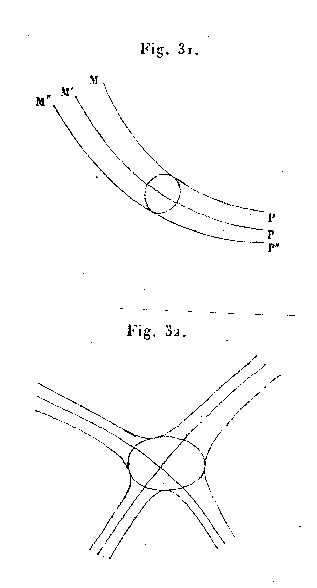 Si le cycle infiniment petit n'enveloppe aucun point singulier, nous pourrons toujours supposer qu'il est convexe, car, s'il ne l'était pas, on pourrait le décomposer en plusieurs cycles plus petits encore et convexe. Alors la figure 31 indique que le cycle a seulement deux contacts extérieures avec les trajectoires MP et M"P".