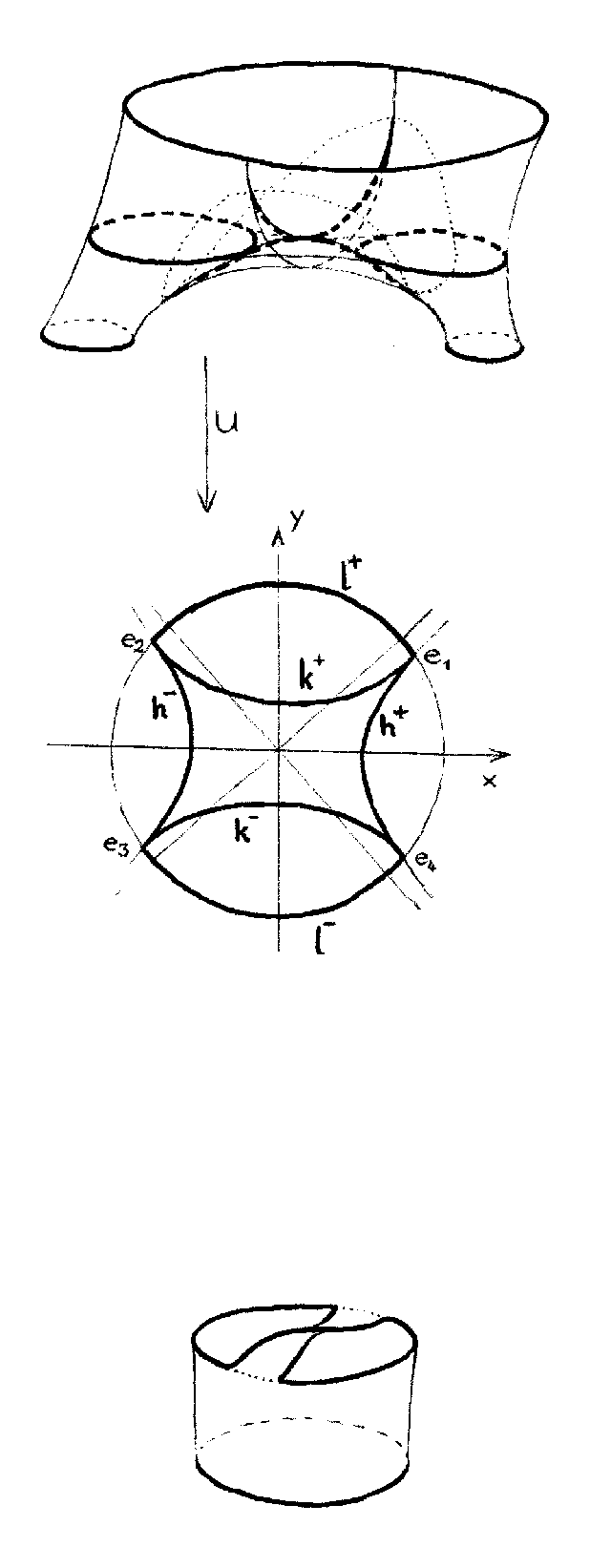 Eine ähnliche Betrachtung kann für den Fall durchgeführt werden, daß die Urbilder unter u von h+ und h- in verschiedenen geschlossenen Linien von f-1({c+(e2/4)}) liegen. Dann bezeichnen wir mit l+ und l- die auf dem Rand von Ue liegenden Bögen (e2,e3) und (e4,e1). T ist dann wieder homöomorph zu H+B+B'+B", wobei B=(k++l++k-+l-)´[-1,0], B'=(h++l+)´[0,1] und B"=(h-+l-)´[0,1].