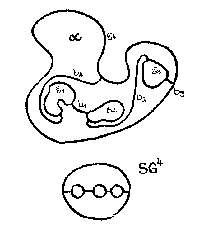 Nun gibt es mit der oben angegebenen Erweiterung des Riemannschen Abbildungssatzes einen Homöomorphismus h zwischen einer der beiden Zusammenhangskomponenten und dem oberen Teil y³0 von SGn. Zwischen der anderen Komponente und dem unteren Teil y£0 von SGn gibt es dann insbesondere einen solchen Homöomorphismus, der auf den Schnittbögen mit h übereinstimmt. Somit haben wir einen Homöomorphismus zwischen a und SGn konstruiert.