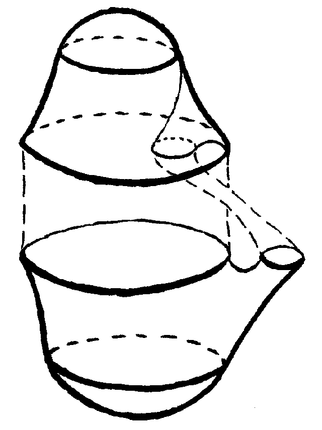 Möbius denkt dabei offenbar an ein Gebiet vom Typ T2´[0,1]. Ein kleiner Volltorus kann aber auch so aus einem anderen Volltorus ausgebohrt sein, daß um ihn eine nicht-berandende 2-Sphäre gelegt werden kann. Außerdem kann die Ausbohrung verknotet sein. Diese Aussage von Möbius erweist sich damit schon aus kombinatorischen Gründen als falsch.